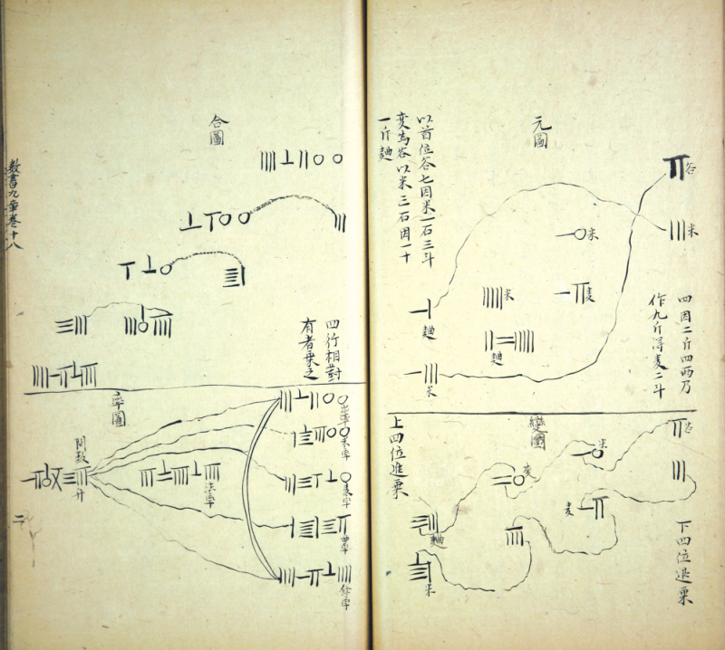 秦九韶完成《数书九章》之时,“立术具草,间以图发之”,未曾预料到这实为其在数学上最大之成就。秦氏先以筹码表达数字,进而在算图中以线条连接数字表达运算。笔者按秦书赵钞本算图之中726根连线分析,总计700根连线用以表达加减乘除运算,而其中超过90%有统一的书写规则,即单波浪线连接两数之首尾,表乘法;单虚线连接两数的首尾,表除法;双实线连接两数的尾尾,表加法;单实线连接两数的尾尾,表减法。由此,秦氏实际建立起中国数学的一套加减乘除符号。从世界数学史的角度来看,数学的符号化和文本化是古代数学通向现代数学的必经之路(如西方在文艺复兴时期完成了符号化进程),因此秦氏所为,实际开启了中国数学向现代数学转变的伟大历程。