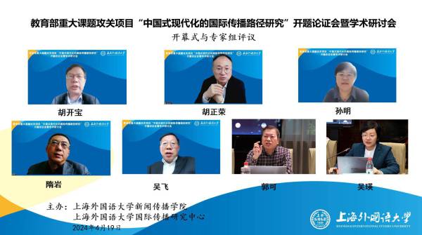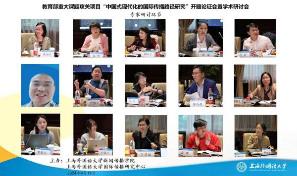 中国社会科学网上海讯(记者 查建国 陈炼)4月19日,由上海外国语大学新闻传播学院教授、国际传播研究中心主任吴瑛教授担任首席专家的教育部哲学社会科学研究重大课题攻关项目“中国式现代化的国际传播路径研究”开题论证会暨学术研讨会在上海外国语大学举行。来自中国社会科学院、中国外文局、中国传媒大学、浙江大学的专家学者和课题组成员20余人以线上线下相结合的形式参加会议。