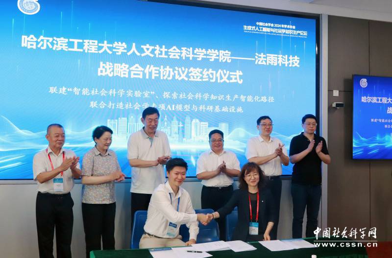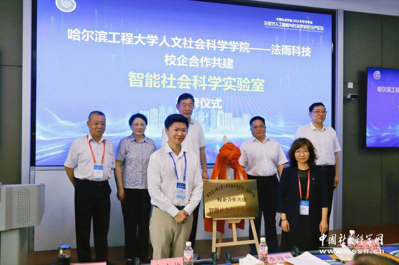 会上举行了哈尔滨工程大学人文社会科学学院——法雨科技校企合作共建“智能社会科学实验室”揭牌仪式。双方聚焦“生成式人工智能背景下社会科学知识生产与科研基础设施建设”,共同探索社会科学知识生产智能化路径。随后,郑莉与法雨科技董事长、法雨研究院理事长张润泽签署了哈尔滨工程大学人文社会科学学院——法雨科技智能社会科学战略合作协议。