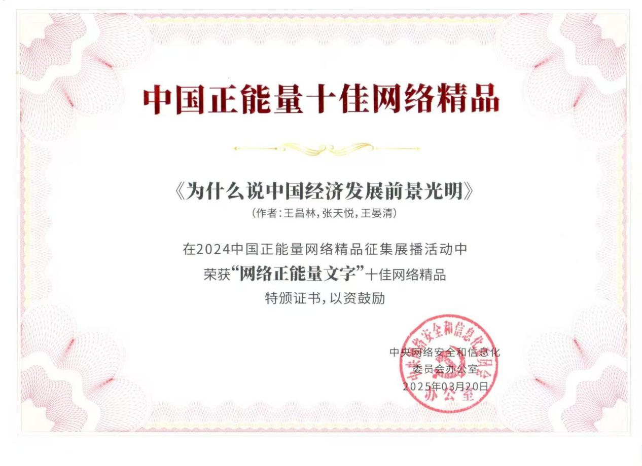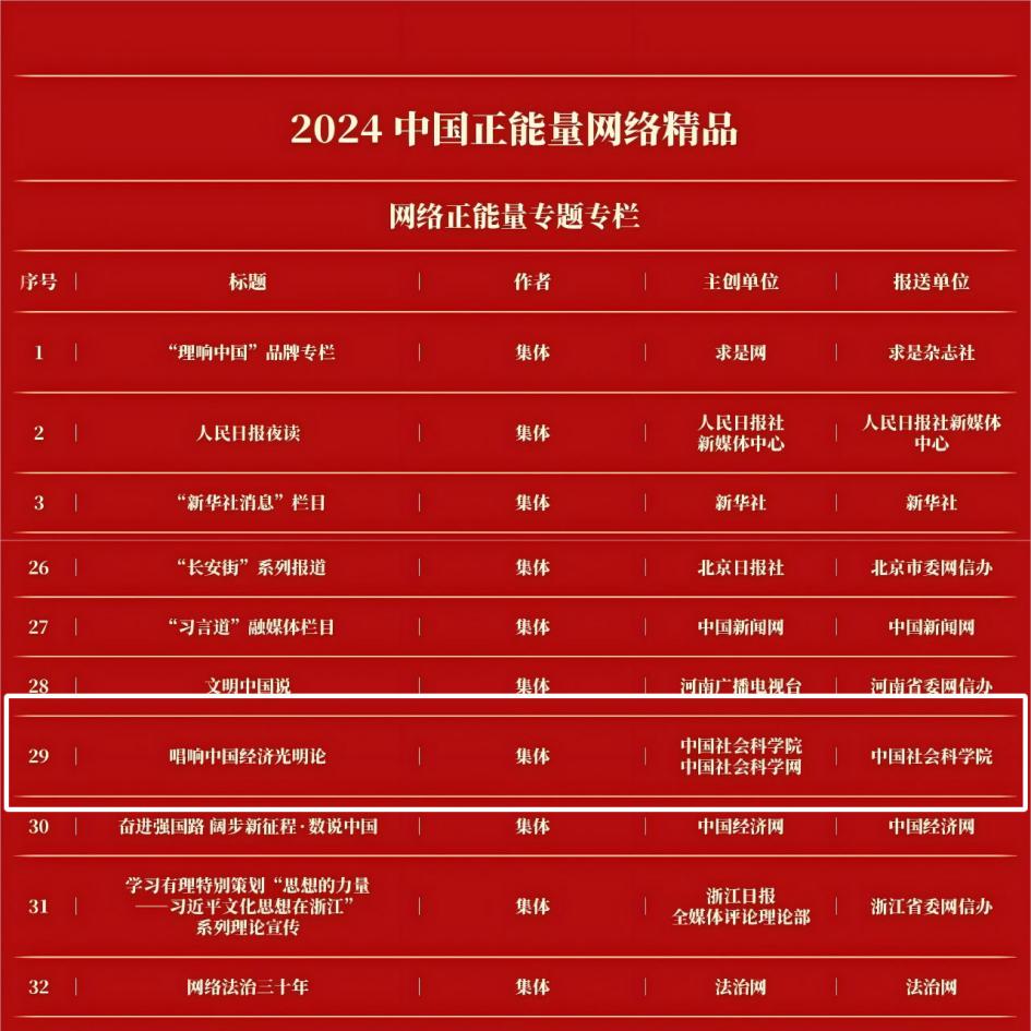 《唱响中国经济光明论》获评2024中国正能量网络精品之网络正能量专题专栏。本专栏邀请专家学者从历史逻辑、理论逻辑和现实逻辑出发,深入阐释中国经济的光明前景,鼓舞士气、凝聚共识,为做好新时代经济工作提供有力的舆论支持。专栏包括29篇文章,涵盖“谱写中国经济发展新篇章”“坚持‘两个毫不动摇’”“发展新质生产力”“推动经济绿色高质量发展”“抓好‘三农’工作”“促进民营经济发展壮大”等丰富主题。