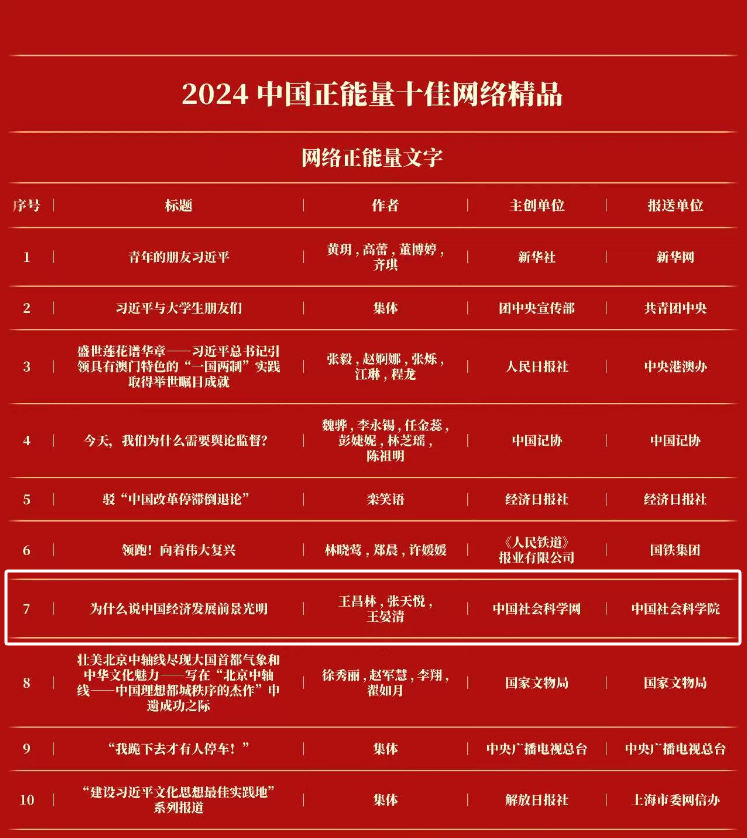 《为什么说中国经济发展前景光明》获评2024中国正能量十佳网络精品之网络正能量文字。《为什么说中国经济发展前景光明》一文从中国经济的历史逻辑、理论逻辑和现实逻辑出发,深入浅出,观点鲜明,指出了中国经济正在回升向好,发展前景光明,有力地驳斥了中国经济衰退的论调。文章指出,我们需要全面客观辩证认识、理性看待中国面临的复杂经济形势。作者强调,只要我们发挥自身优势,正视困难问题,着力深化改革开放,中国必将不断创造新的经济发展奇迹,中华民族必将以不可阻挡的步伐迈向伟大复兴。