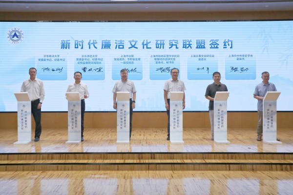 为推动新时代廉洁文化研究走深走实,研讨会现场举行了新时代廉洁文化研究联盟签约仪式。上海市社联党组成员、专职副主席、一级巡视员任小文,华东师范大学党委副书记、纪委书记、纪检监察研究院院长曹友谊,华东政法大学党委副书记、纪委书记陈玉刚,上海市新四军暨华中抗日根据地历史研究会副会长、秘书长曹景文,上海炎黄文化研究会副会长刘平,上海市中共党史学会副会长张劲作为代表上台签约。