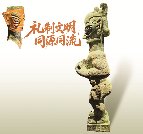 夏、商、周代表的中国青铜时代文明的基本文化特征是,以青铜礼器为中心,形成一整套代表国家权力与等级秩序的礼仪制度体系。青铜礼器制度体系的形成,不仅是中国早期文明形成的标志,而且对整个东亚早期文明体系的形成产生了深远影响。在四川大学历史文化学院教授霍巍看来,三星堆遗址的考古发现,随着1986年两个祭祀坑的揭露达到高峰,发掘出土的巨型青铜人像、造型奇特的青铜面具、发式各异的青铜头像以及覆盖其上的黄金面具、数株高大的青铜神树、黄金制作的“权杖”等,均展现了其独特的文化面貌。随后发现的成都金沙遗址、十二桥遗址等青铜时代遗存,也属于三星堆文明体系。三星堆文明的发现,丰富了人们对东亚青铜文明体系的认识。