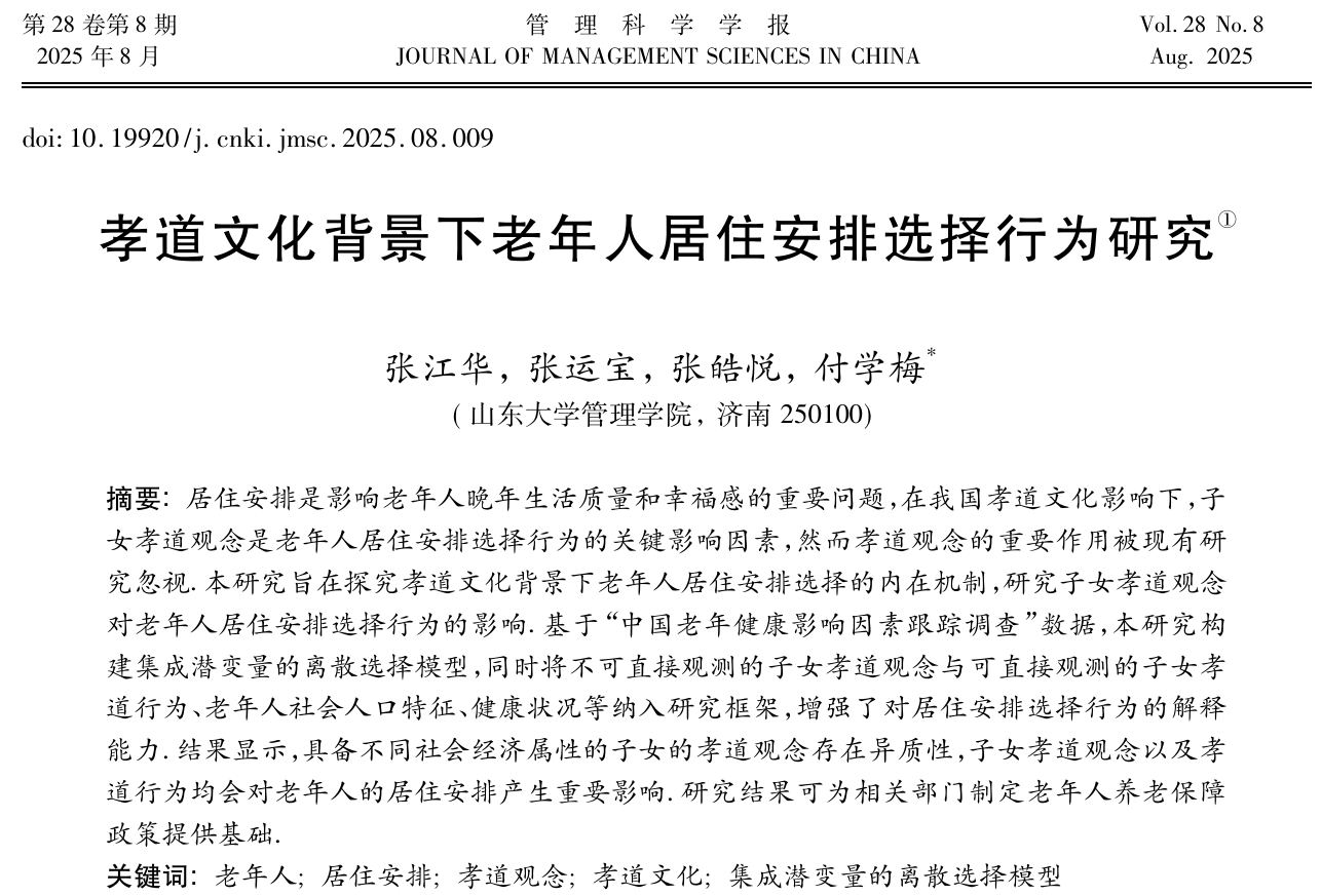 中国社会科学网讯 近日,山东大学管理学院张江华教授、付学梅副研究员指导博士研究生张运宝、硕士毕业生张皓悦,在《管理科学学报》发表研究成果“孝道文化背景下老年人居住安排选择行为研究”。《管理科学学报》作为国内管理科学与工程领域的权威期刊,被国家自然科学基金委员会管理科学部认定为A类期刊,在FMS管理科学高质量期刊评级中列为T1级别,具有广泛的学术影响力。