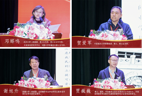 主旨报告环节,邓郦鸣以“新外语背景下体裁素养与专门用途英语(ESP)教师发展”为主题,阐述体裁素养与教师专业发展的内在关联,提出提升教师体裁素养的实践路径,为外语教师队伍建设提供新思路。中国海洋大学教授贺爱军聚焦“翻译学位论文的选题与写作”,从学位论文与学术论文的区别切入,针对论文选题命名、写作规范等关键问题展开细致解读,为英语专业学生的培养质量提升提供精准指导。华语教学出版社副社长贾巍巍围绕“技术赋能大规模因材施教与教材创新——AI驱动的教育范式转型”作报告,提出通过完善知识图谱、深化教育大模型应用,实现课程、教材、教学的智能化升级,构建“诊断-资源-实践”闭环赋能模型,展示技术赋能教育公平与质量提升的可行方案。对外经济贸易大学教授李琳分享“数字赋能商务英语智慧课程建设的实践与探索”,展示如何通过数字技术整合教学资源,打造“理论-实践-思政”三位一体的智慧学习平台,促进学生语言能力与商务技能全面提升。