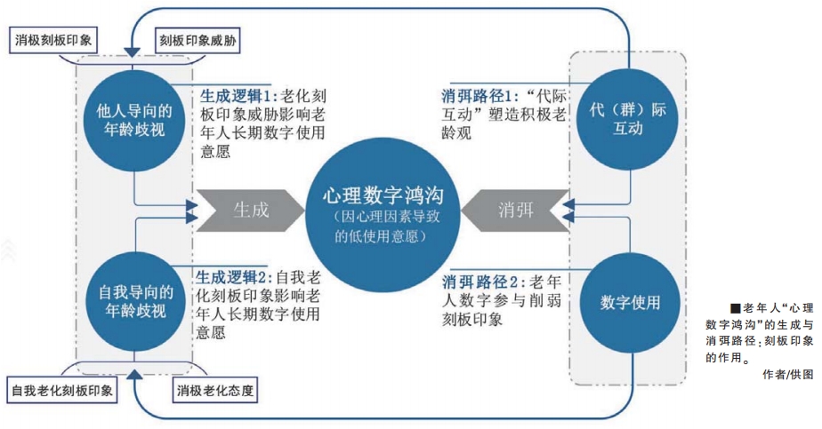 老年人刻板印象与其心理数字鸿沟是一个双向循环系统。数字参与反过来能解构老年群体消极的自我刻板印象、增强其数字使用的感知效能,驱动老年群体与年轻群体的整体数字融合。有研究表明,老年人低信息技术使用可预测其未来更负面的老化自我认知;而有参与互联网活动的老年人比不使用互联网的同龄人自我感觉更年轻。在老年群体内部,积极使用技术的老年人对同年龄组中的非使用者也持有消极的年龄刻板印象;也就是说,活跃的技术用户将自己与年长的非用户群体明显区分开来。