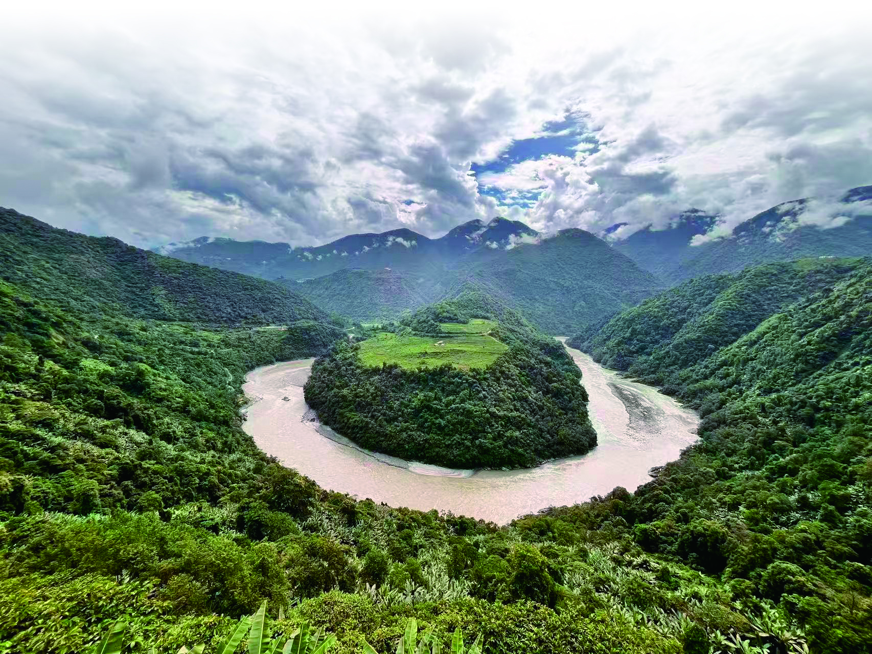 踏入果果塘的那一刻,这份独特性便有了最直观的注解:站在玻璃地面的悬空观景台上,脚下是云雾漫过的雨林树梢,眼前铺开的则是一幅让呼吸停滞的画卷:雅鲁藏布江挣脱山谷束缚,以180度的舒展姿态,在墨脱的土地上勾勒出“Ω”形弧线,那流畅的曲线像是地球用江水亲笔写下的诗句。