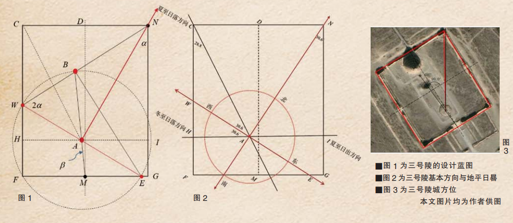 有意思的是,献殿与陵城东北角的连线AN与东墙的夹角为30.6°。按照三号陵所在的地理纬度和建造时的黄赤大距,可推算出以献殿为观测点的冬夏至日出日落太阳方位角为30.7°。