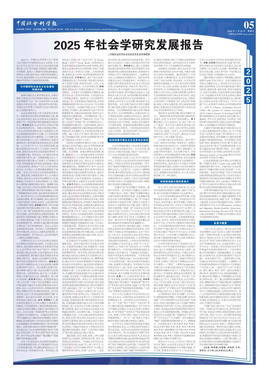 2025年,中国社会学界深入学习贯彻习近平新时代中国特色社会主义思想,尤其是习近平总书记关于社会主义社会建设的重要论述,立足“学术基础、实践导向、国际视野、历史维度”,直面人工智能时代的机遇和挑战,坚持先立后破、稳中求进,在服务党和国家工作大局、推进中国自主社会学知识体系构建、增强学科影响力方面取得显著进展。