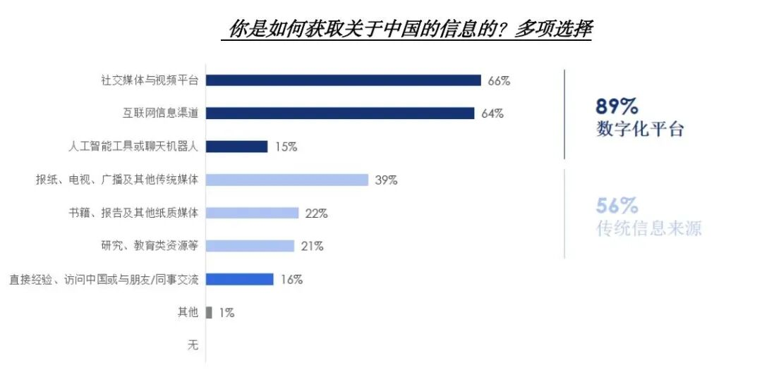 社交媒体和视频平台(66%)以及新闻网站等互联网渠道(64%),是他们获取中国信息的最主要来源。