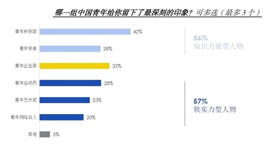 结果显示,青年科学家和青年企业家这两类中国青年最受他们认可: