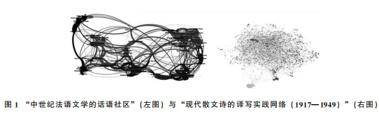 尽管如此,社会网络分析绝非简单地等同于人际关系的分析。网络由关系构成,但是关系并不天然是网络。网络更是一个分析概念,是研究者的思维建构,它为研究人际关系、社会结构乃至更普遍的事物结构提供了一个模型。正是基于此,考古学家以考古遗址为节点、以是否曾发掘出同类器物为关系,来构建文化交流网络;经济学家以国家为节点,以贸易往来情况构建国际经济关系网;语言学家根据对语料所做的语法、语义依存的标注,构建句法语义依存关系网络;文学史研究在对家集或著作编年进行数据挖掘的基础上,建构起文人之间的酬唱关系网络;文体学研究则尝试用单维或多维文体特征建立起某种文体关系网络(图1); 如此种种,不一而足。