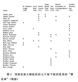 在这一思路的影响下,近二十年来先后有两位社会学家,以相对简单或复杂的办法将焦点转移到了这样一个问题上来:为什么是保罗·里维尔?这个革命前夜的“吹哨人”的角色有没有可能由别人来担当?历史真的只是受到一种偶然性,或者说行动者的主观性驱使的吗?于是,杜克大学的社会学家希力(Kieran Healy)教授也讲了一个故事。他把时间的节点设置在1774年初,那是各个自发的爱国者组织暗潮涌动的时刻,他从费舍尔著作附录中发现了活跃在波士顿地区的七个不同地下组织的245个会员的“黑名单”(图2),试想,如果费舍尔是一名效忠大英帝国的老牌特勤人员,他手里已经握有这份名单,那么,有没有可能在事情发生之前,就利用这份名单,来发现保罗·里维尔这样一个或者多个可疑人物?