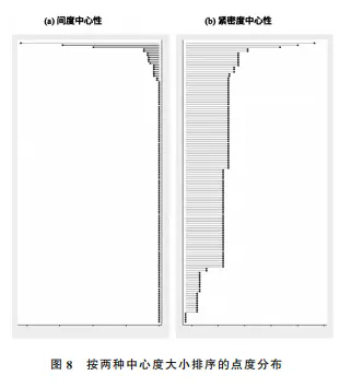 继而,如果同样采用中心度指标来考察,还可以把各种中心度的分布列出来(图8)。在网络中大部分组织成员的中介中心度即间度中心性为零,根本不具有跨社区的桥接作用,只有少数人的中介性极大,他们显然填补了社群之间的“结构洞”,也造成了不平等分布。紧密度中心度也同样如此。如果同时移除里维尔和沃伦这两个中介度极高的节点,则图的总密度下降了31%,对连通性造成极大影响。返回到原始数据中细读,会发现这是因为绝大多数人(约82%)只存在于一份名单上。没有人能够出现在全部七组名单上,只有两个人在多达五份名单上出现——就是约瑟夫·沃伦和保罗·里维尔。据此,作者认为此二人在网络中的位置是同源性的。