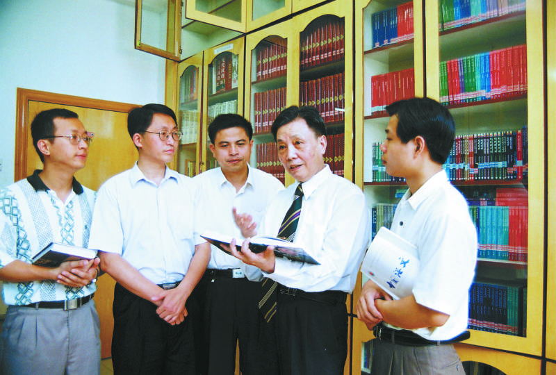 邢福义先生指导学生。(摄于2003年,左起:陈世祥、黄忠廉、刘培玉、邢福义、匡鹏飞)匡鹏飞/供图