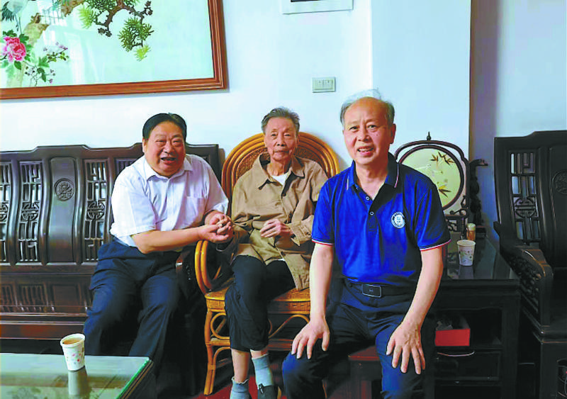 李宇明教授看望邢福义先生。(摄于2022年,左起:李宇明、邢福义、汪国胜)李宇明/供图