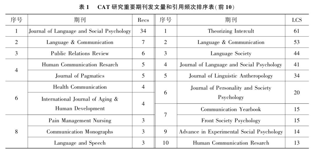一般而言,通过载文期刊的分布可以反映某一理论被哪些学科和领域所关注。 对本地数据集文献载文期刊分别以 Recs 和 LCS 进行排序统计,选择位列前10 的期刊,如表 1。 无论是发文量还是引文频次,CAT 载文期刊主要集中在语言学、社会心理学和新闻传播学三个学科,其中 Journal of Lan- guage and Social Psychology 在发文量和引文频次都高居前列。 另外载文期刊也涉及健康、医疗等领域,这也符合 CAT 作为一种关于交流适应的基础理论和解释性框架在健康、医疗、跨文化等领域具体运用的现状。