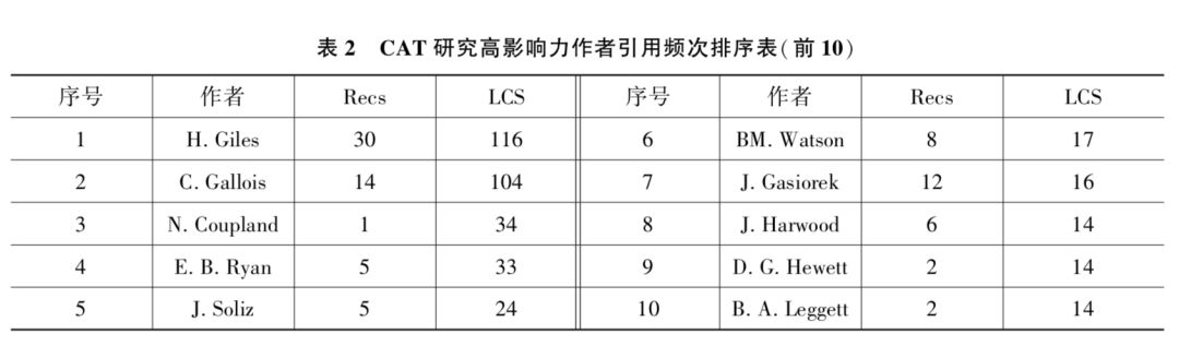 综合分析本地数据集中作者文献发文量和引文频次,并进行排序统计,排序前 10 的见表 2。 从表中可知,Howard Giles( Recs = 30,LCS = 116) 和 Cindy Gallois( Recs = 14,LCS = 104) 两位学者影响力 较为突出。 其中,Howalrd Giles 为 CAT 的提出者,现为加州大学圣塔芭芭拉分校教授,研究兴趣从早期语言和交际的社会心理学转向跨学科的交际沟通,一直致力于研究 CAT 在跨群体的应用和发展; Cindy Gallois 现为澳大利亚昆士兰大学教授,研究兴趣在于健康环境下群体间的交流、跨文化沟通,尤其对于医患护理沟通较为关注。