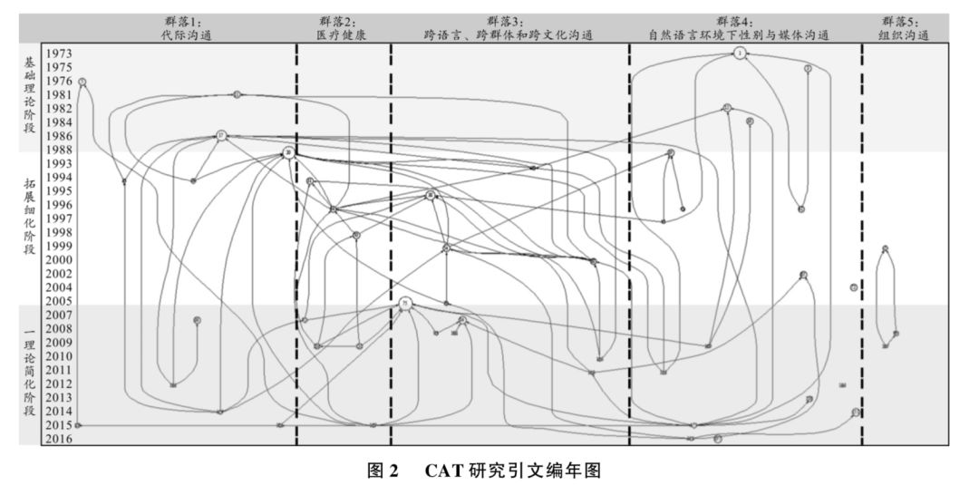 基于美国科学引文(Web of Science)数据库中 CAT 相关文献,本文运用引文图谱分析软件HistCite 展开文献计量分析,以图谱的方式展示 CAT 的研究现状和理论脉络;并结合内容分析法对CAT 在各领域的现实应用进行了梳理。研究发现在理论提出的 40 余年间,CAT 经历过了多次理论 的完善,发展的理论脉络先后经历了三个阶段:从早期汲取社会心理学理论理解社交场合中言语风 格的趋同和趋异策略以及背后动机,扩展至复杂且能涵盖不同群体的传播过程的交际理论,再简化 成为群体沟通的一般通用性理论,这一路径反映出理论“ 建构—深化—简化” 的整体线索。
