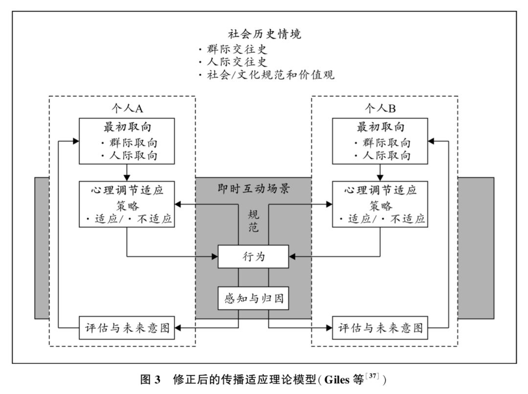 与之前的模型一样,将群体间的互动置于社会历史背景(sociohistorical context)中,突出了群体关 系与人际关系的历史、规范及价值观的作用,描述了个体间的沟通互动过程。首先,交流双方如何调 整他们的沟通行为通常是基于他们的初始取向(initial orientation),即在进入沟通之前人们已有的目 标、信念和倾向。这些初始取向受到说话者的群际历史、人际交往历史和社会文化价值与规范的影响,而且初始取向决定了互动双方是采用人际关系还是群际关系取向去看待沟通行为。人际关系取 向基于个人身份的显著性,而群际关系取向是基于社会身份的显著性。人际交往的历史程度可以从 未接触的亲密关系去做衡量,当沟通双方有积极的人际历史,他们可能倾向于人际关系取向,并采取 趋同策略;相反,当双方的人际交往历史是负面的,他们则可能倾向于群际关系取向而采取趋异策 略。另外,社会文化价值与规范影响着人们与谁、在何种场合、如何采取恰当的互动行为,不仅能够 限制群际接触的机会,也可以塑造交流双方的互动行为。Marlow 和 Giles[35] 的研究发现,尽管夏威夷 当地居民更喜欢说当地的克里奥尔语,但出于各种需要,他们在工作和教育中经常使用标准的英语。这种基于尊重、义务或者社会规范的适应被称为非意愿的妥协[36] 。