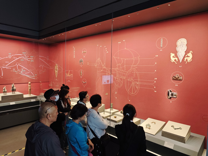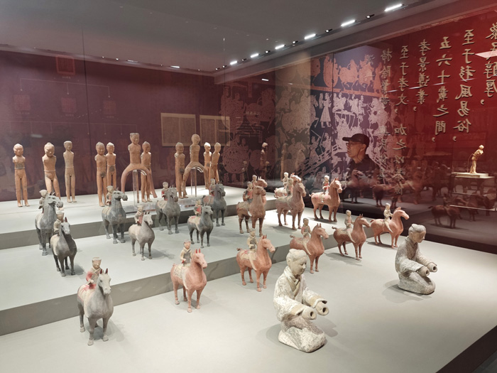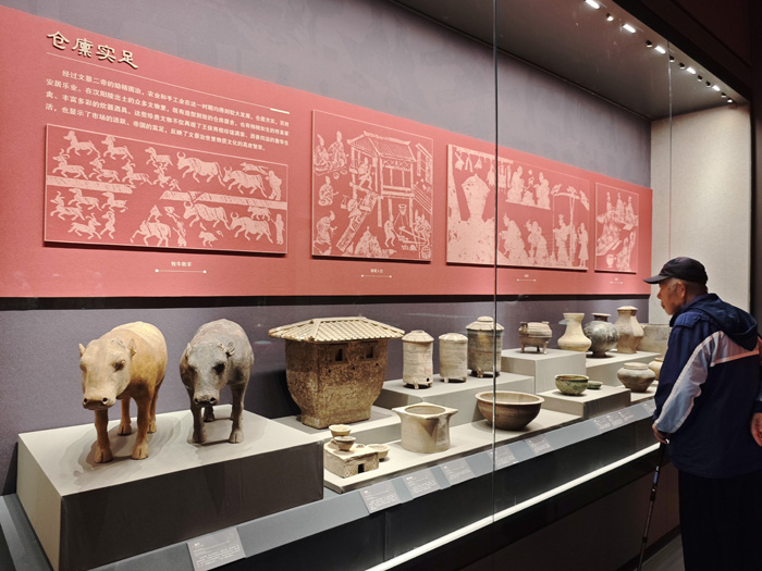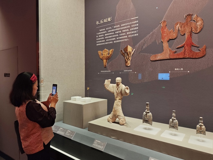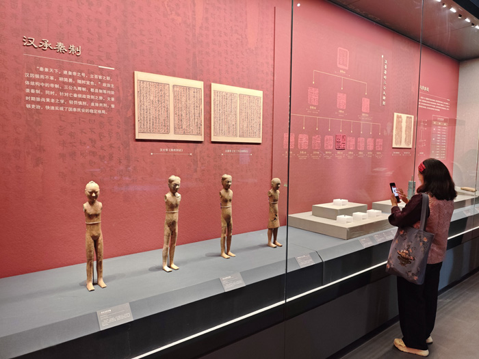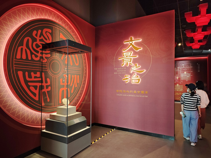 “汉家陵阙”部分以汉景帝阳陵考古发现为切入点,通过瓦当、空心砖等文物,展示汉代帝陵的恢弘气象。“治国之道”部分通过官印、骑兵俑、度量衡、车马器等文物,展现了文景时期政治上的汉承秦制、经济上的与民休息、军事上的秣马厉兵,深刻阐释“文景之治”出现的制度原因。“盛世华章”部分将家畜、钟磬、金器、舞伎俑、侍女俑、文吏俑等文物分为仓廪实足、礼乐昭彰、风华绝代三个主题,通过简约典雅的器具、风姿绰约的陶俑一展文景时期的艺术生活之美,体现了大汉治世气象。