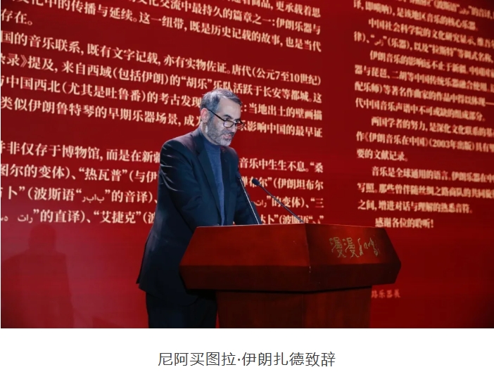 伊朗伊斯兰共和国驻华大使馆文化参赞尼阿买图拉·伊朗扎德在致辞中表示,中伊音乐联系源远流长,且持续在当代融合。伊朗乐器及音乐理念沿丝路传入中国,深刻影响了新疆等地的音乐实践,许多乐器名称和音乐术语至今保留着与波斯语的联系。音乐是文明对话的桥梁,丝路上传承的旋律将继续为增进中伊相互理解谱写和谐的音符。
