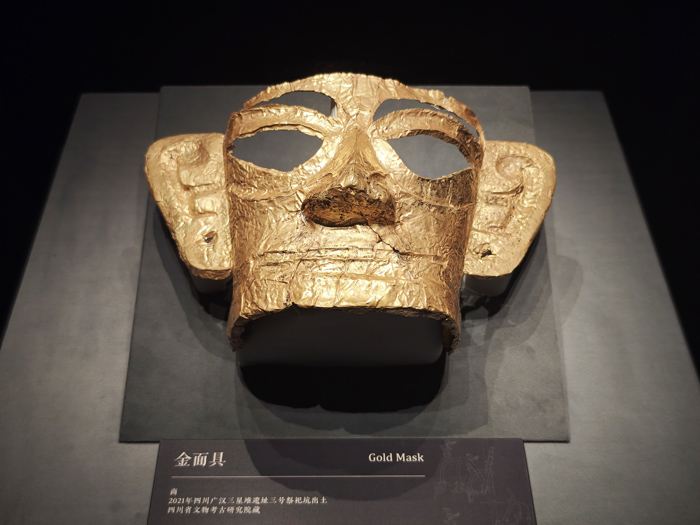 三星堆博物馆藏戴冠纵目面具与中国国家博物馆藏戴冠纵目面具在本次展览中并列展出,这是自1986年三星堆祭祀坑发掘以来,这两件标志性青铜面具的首次同台亮相。