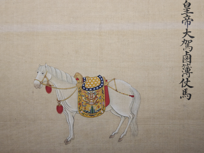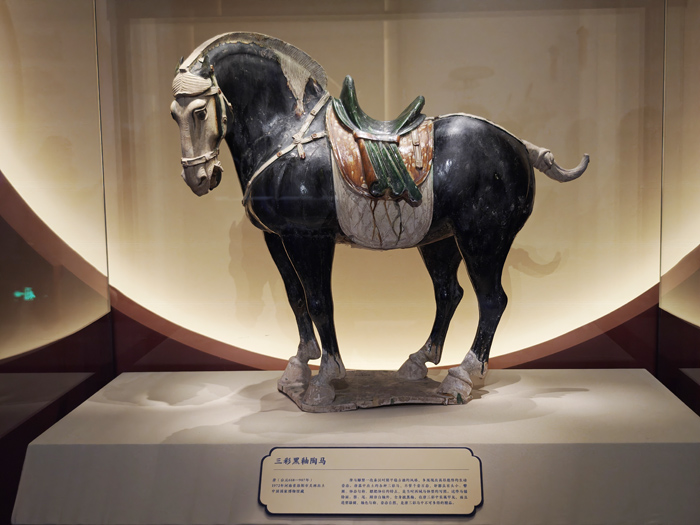 展品中,唐代的“三彩黑釉陶马”除面、鬃、尾、蹄涂白釉外,全身披黑釉,在唐三彩中实属罕见,而且造型雄健,釉色匀称,姿态自然,是唐三彩马中不可多得的精品。西汉的“木胎漆马”通体髹以黑漆,眼、耳、口、鼻处施有朱漆,马肌体雄健,神采奕奕,具有明显地域特征。清代的《十八骏图卷》骏马腾跃顾盼,造型准确,动态强烈,毛发描摹细腻,整体有明暗,富于立体感。