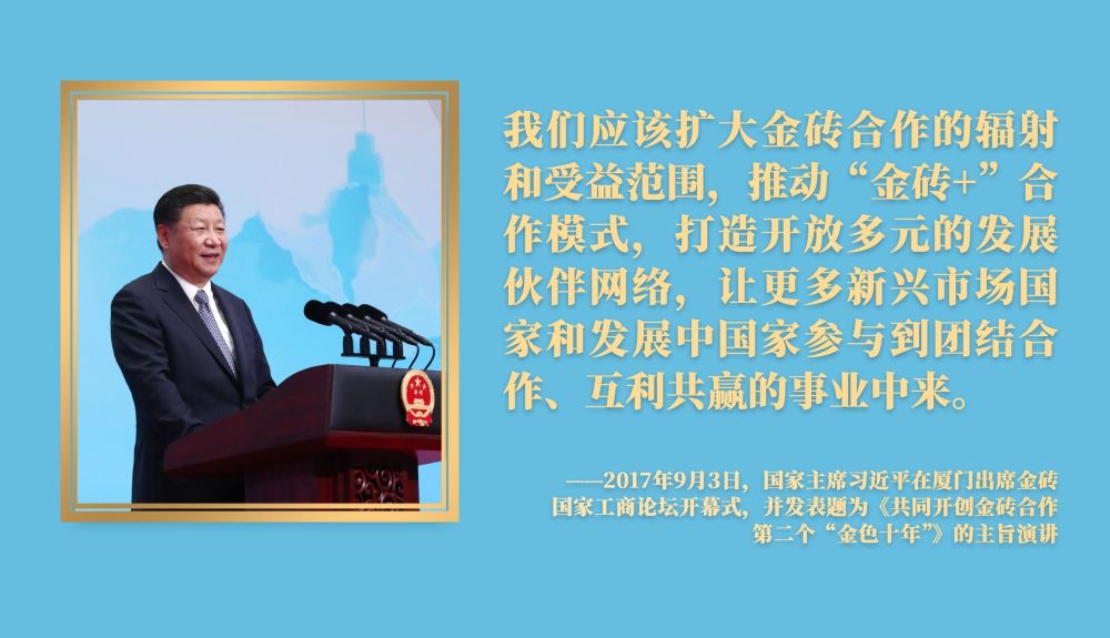 面向未来,金砖国家敞开大门谋发展、张开怀抱促合作。中国将携手金砖伙伴,推动“大金砖合作”不断取得新成果。