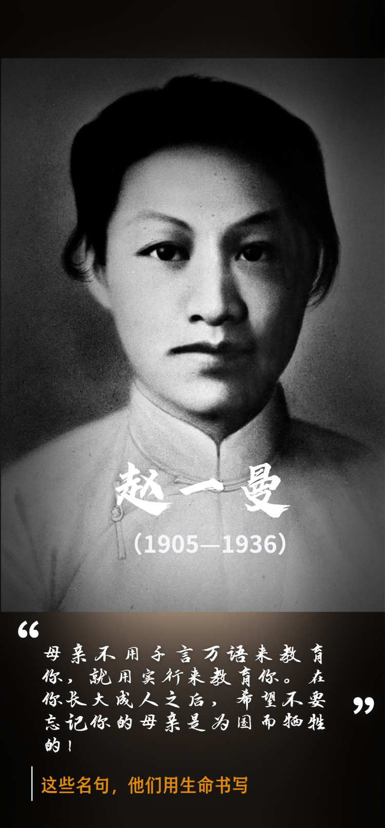 赵一曼,原名李坤泰,1905年10月25日出生在四川宜宾的一个地主家庭。1923年冬,赵一曼加入中国社会主义青年团。1926年夏加入中国共产党。 1935年秋,赵一曼任东北抗日联军第3军1师2团政治委员。11月间,第2团被日伪军围困于一座山间。赵一曼为掩护部队突围,身负重伤,养伤期间被日军发现,战斗中再度负伤,昏迷被俘。1936年8月2日,赵一曼壮烈牺牲,年仅31岁。