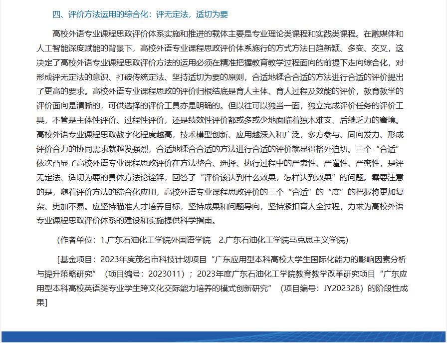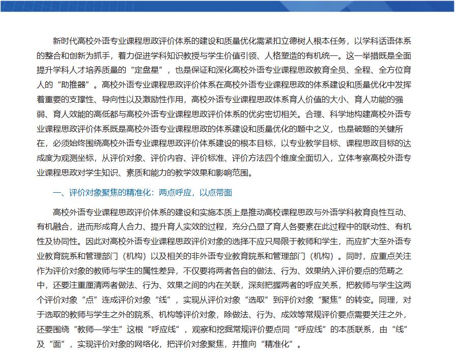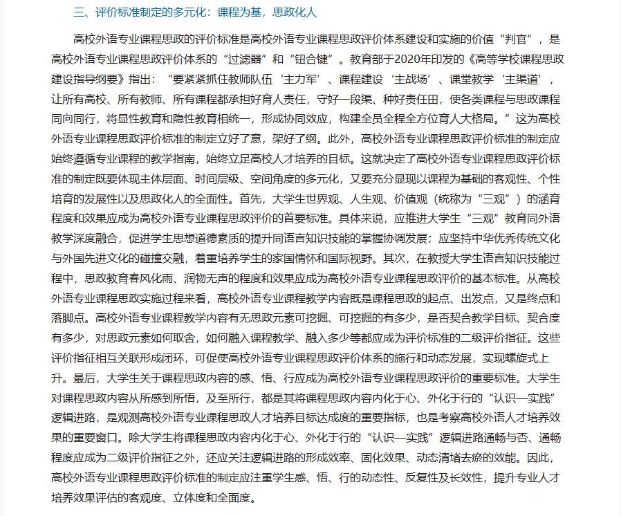摘要:新时代高校外语专业课程思政的体系建设和质量优化紧扣立德树人根本任务,在高校外语专业课程思政的体系建设和质量优化中发挥着重要的支撑性、导向性以及激励性作用。合理、科学地构建高校外语专业课程思政评价体系既是高校外语专业课程思政的体系建设和质量优化的题中要义,更是破题的关键所在。本文围绕高校外语专业课程思政建设的根本目标,以专业教学目标、课程思政目标的达成度为观测坐标,从评价对象、评价内容、评价标准、评价方法四个维度全面切入,立体考察高校外语专业课程思政对学生知识、素质和能力“三位一体”教育教学效果的实现程度,为高校外语专业课程思政评价体系的构建提供指导。