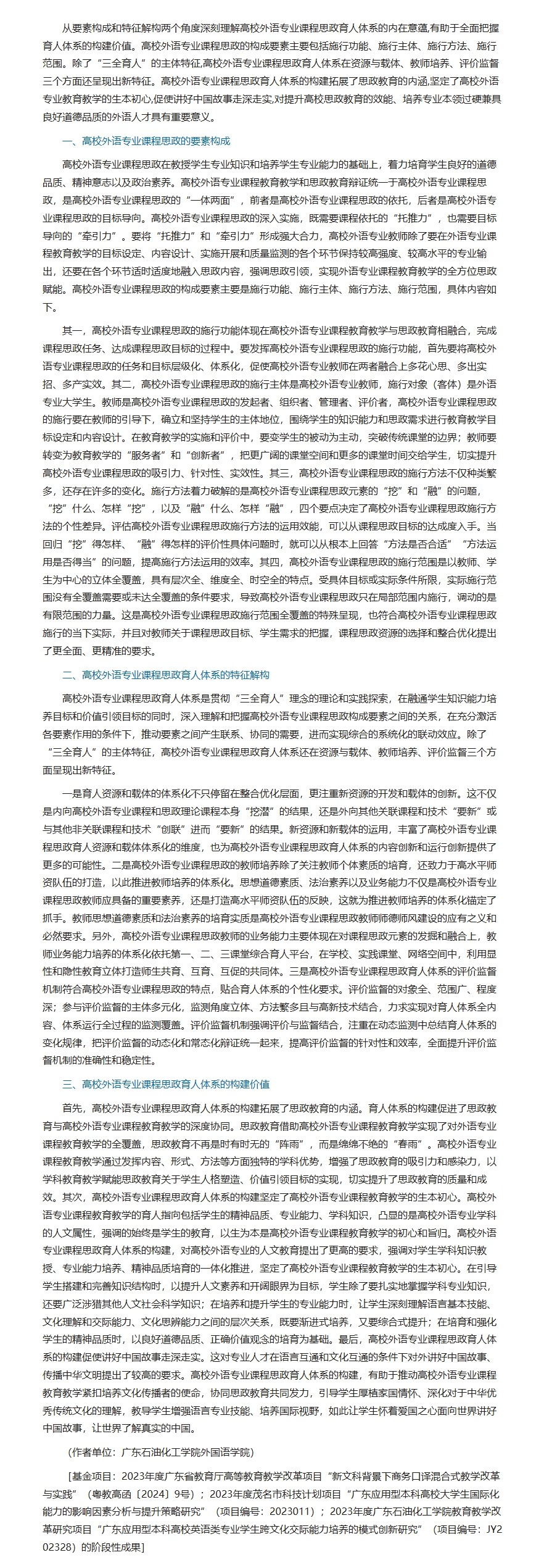 摘要:从要素构成和特征解构两个角度深刻理解高校外语专业课程思政育人体系的内在意蕴 , 有助于全面把握育人体系的构建价值。本文从要素构成、特征解构、构建价值三个方面对高校外语专业课程思政育人体系的内在意蕴与构建价值进行了详细论述,旨在表明高校外语专业课程思政育人体系的构建拓展了思政教育的内涵 , 坚定了高校外语专业教育教学的生本初心 , 促使讲好中国故事走深走实 , 对提升高校思政教育的效能、培养专业本领过硬兼具良好道德品质的外语人才具有重要意义。