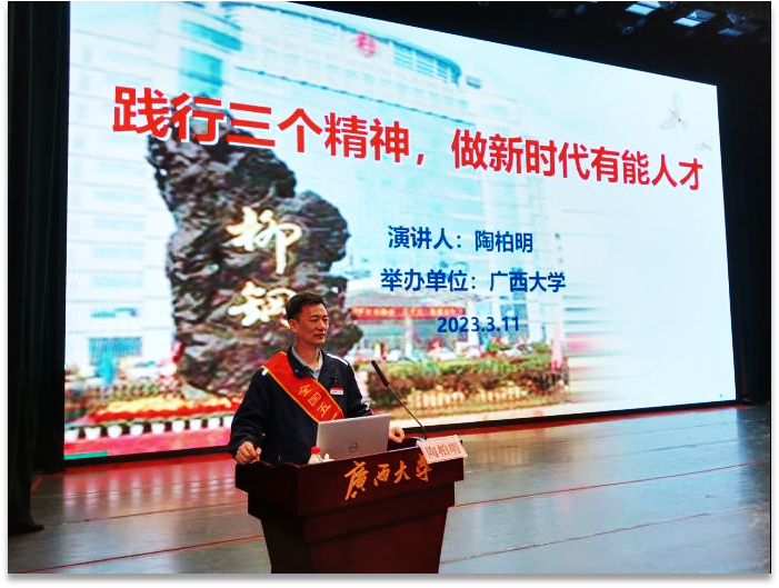 全国“五一劳动奖章”获得者陶柏明为广西大学学生讲授“形势与政策”课