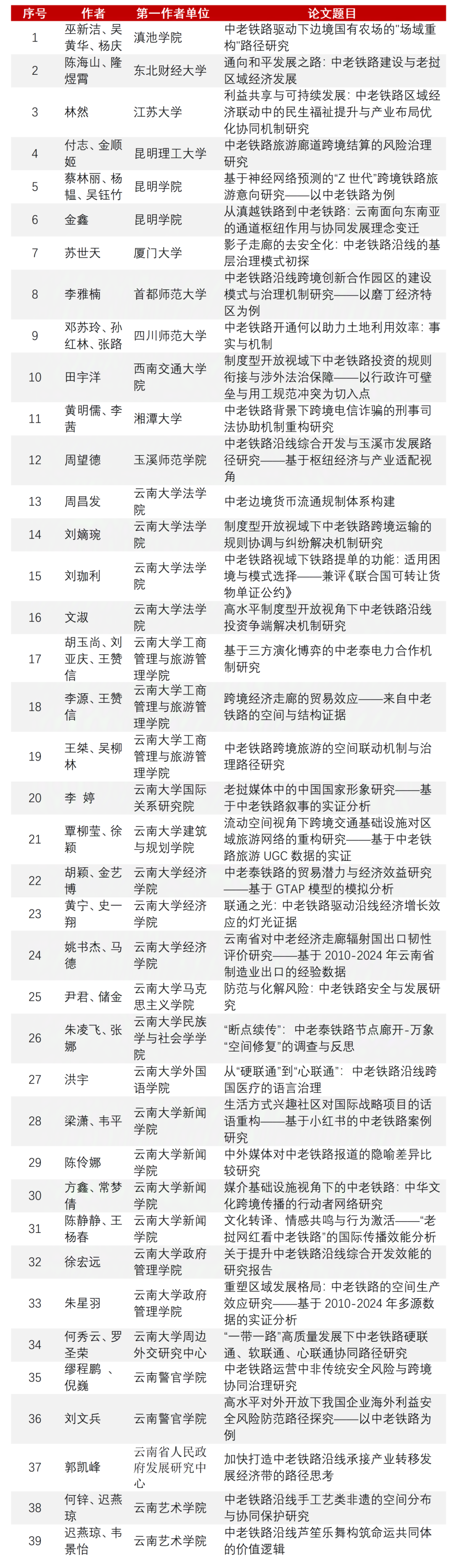 “多学科视野下中老铁路与高水平对外开放研讨会”拟于2025年12月28日在云南大学举办,本次研讨会经专家评审,择优确定入选论文39篇,名单公布如下(按第一作者单位拼音排序)。