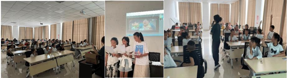 最期待的“哪吒配音”环节到来时,孩子们瞬间沸腾。吴雨娜、金嘉睿播放《哪吒之魔童降世》片段,当“吒儿,你要闹到什么时候啊”的台词出现,大家总把“闹(nào)”读成“lào”,成员们逐字纠正:“是nào,舌尖抵住上牙床哦!”分组练习时,孩子们模仿哪吒的倔强语气,反复练习“闹”“哪”等词,最终“最佳配音小组”捧着星球杯、贴纸欢呼。随后的“天气预报词汇课”上,孩子们争当“小小播报员”,用标准的普通话播报当地的天气。