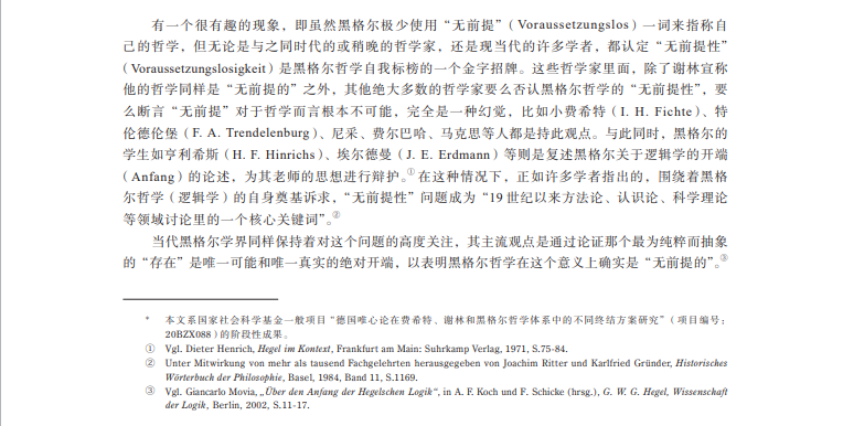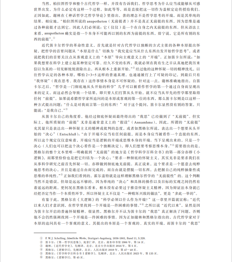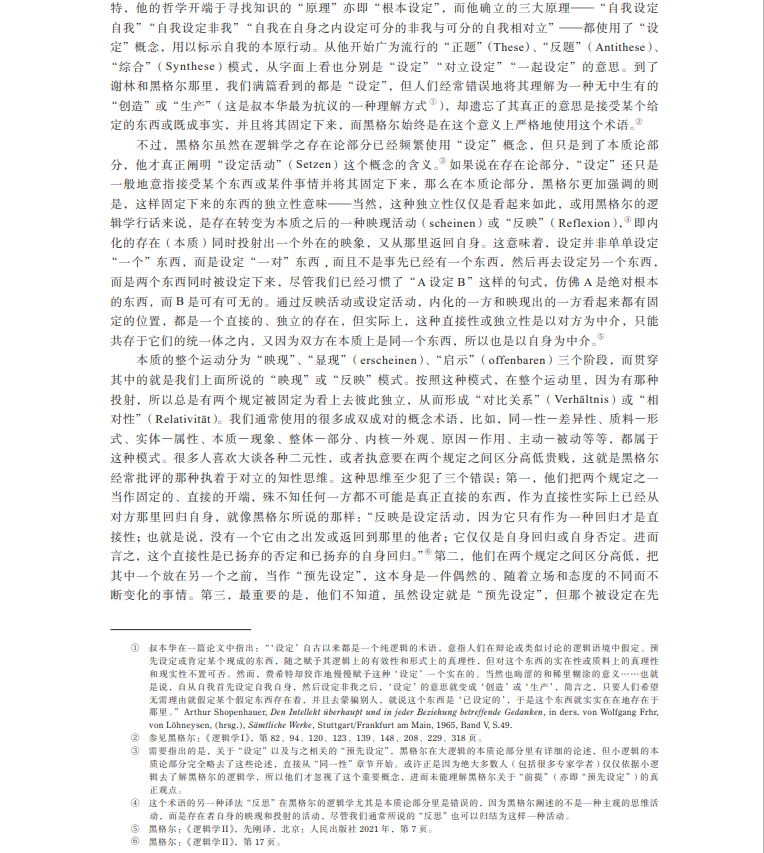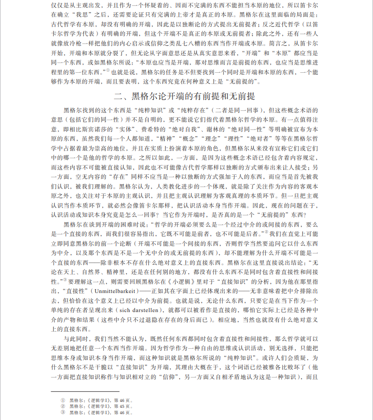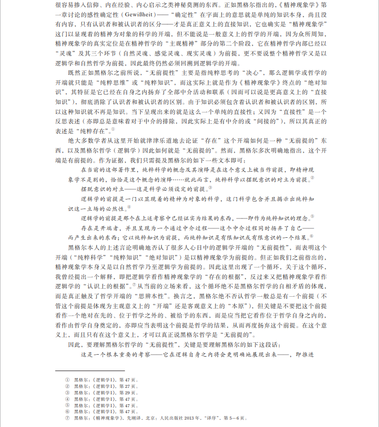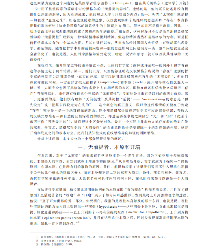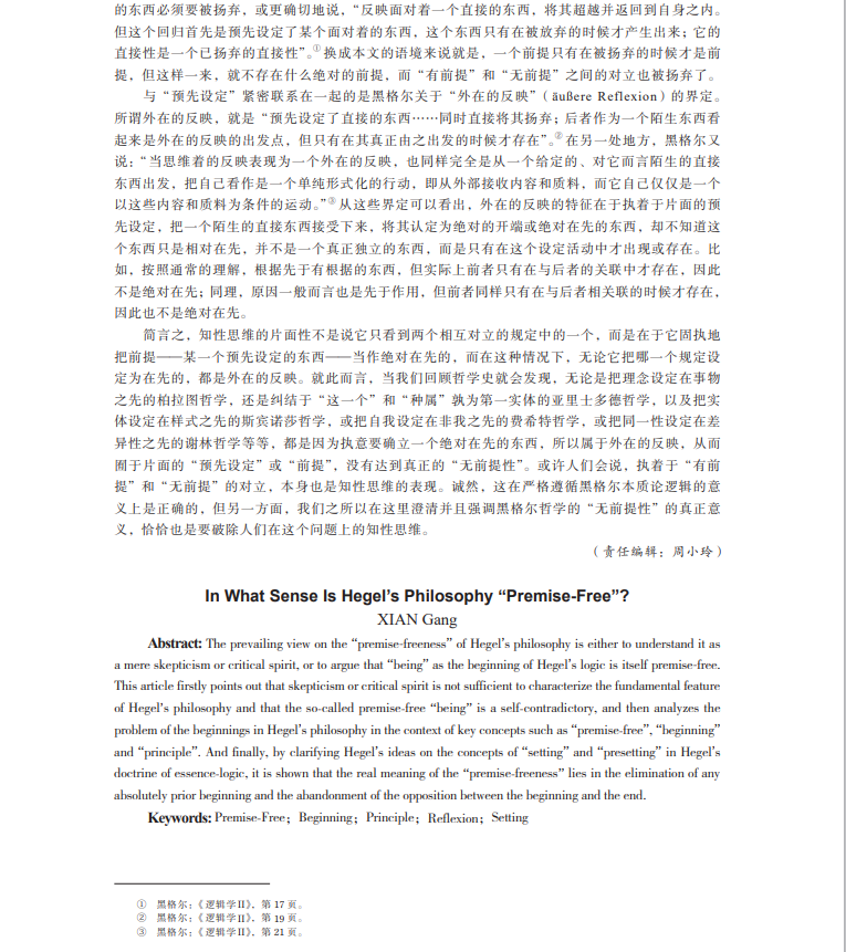 摘要:关于黑格尔哲学的“无前提性”,学界通行的观点是要么把它理解为一种单纯的怀疑主义或批判精神,要么去论证作为黑格尔逻辑学开端的“存在”本身是“无前提的”。文章首先指出怀疑主义或批判精神不足以刻画黑格尔哲学的根本特性,以及所谓“无前提”的“存在”在黑格尔那里是自相矛盾的,然后辨析了黑格尔哲学在“无前提”“本原”“开端”等关键概念语境下的开端问题,最终通过澄清黑格尔在逻辑学之本质论部分里关于“设定”和“预先设定”等概念的思想,表明黑格尔哲学的“无前提性”的真正意义在于破除一个绝对在先的开端,扬弃开端和终点之间的对立。