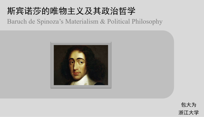 讲座伊始,包大为介绍了本场讲座的主旨与背景。他首先从思想史的角度分析了斯宾诺莎政治哲学所处的重要位置,通过纵向与笛卡尔、霍布斯、洛克、格劳秀斯等哲学家做对比,发现只有斯宾诺莎具有本体论的视角,使得其在后世的研究中呈现出复数的形象。17世纪,斯宾诺莎的唯物主义外衣被撕去;18世纪斯宾诺莎通常被视为泛神论者;到了19世纪斯宾诺莎哲学则成为了革命氛围浓厚的政治条件下溯源辩证唯物主义的重要研究对象;直至20世纪围绕斯宾诺莎的唯理论或唯物论的论争依旧“火热”。如今,如何看待唯物主义,又如何用唯物主义来探讨政治哲学是我们亟待思考的问题。这些问题都或许可以在斯宾诺莎的哲学中找到答案。